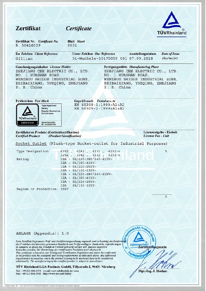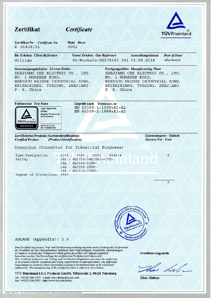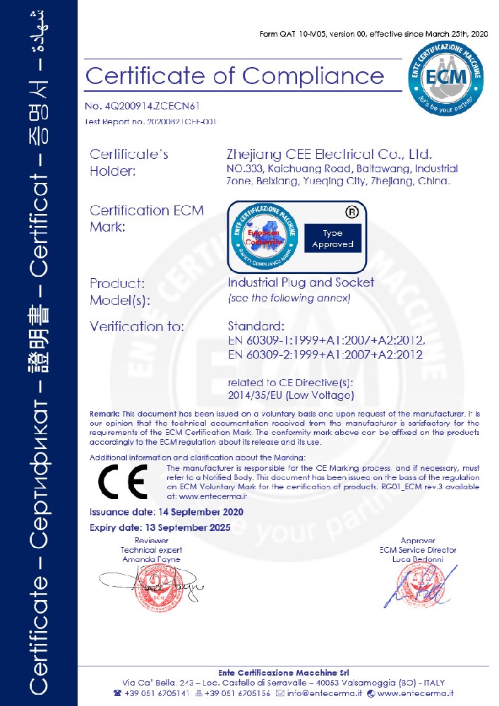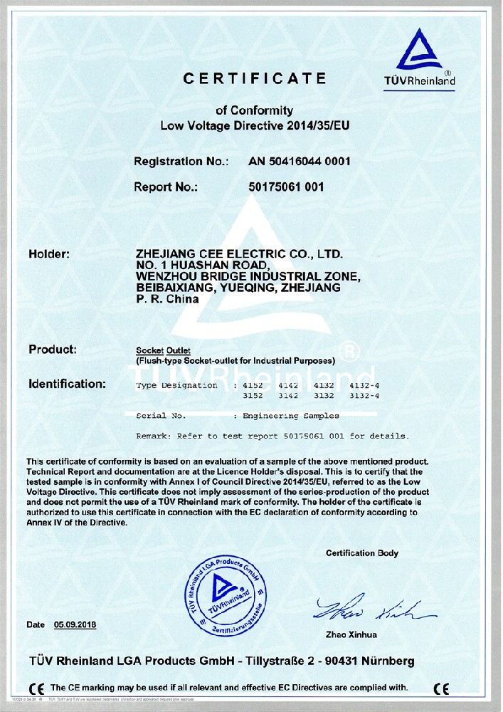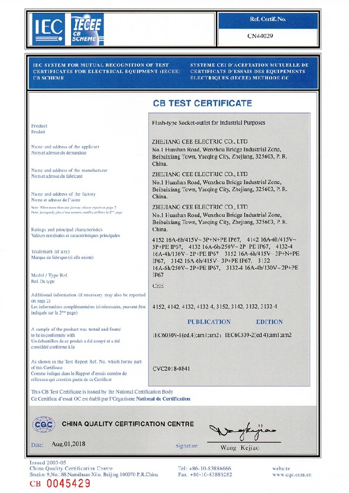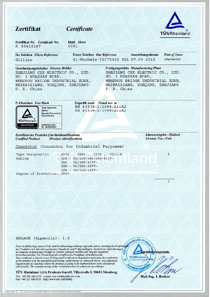 公司全面貫徹實(shí)施IS09001:2015質(zhì)量管理體系認(rèn)證。工業(yè)插頭插座符合IEC 603 09-1-2, EN 60 309-1-2國(guó)際標(biāo)準(zhǔn), 組合插座箱符合EN61439標(biāo)準(zhǔn),并通過(guò)Intertek & TUV Rheinland & CQC等認(rèn)證。證書包括TUV、SEMKO、CE、CB、EAC,并符合RoHS和Reach等適用法規(guī)。公司引進(jìn)先進(jìn)生產(chǎn)設(shè)備和精密檢測(cè)試驗(yàn)儀器、不斷引入高科技工藝流程和技術(shù)人才,為公司的產(chǎn)品研發(fā)、質(zhì)量升級(jí)、管理創(chuàng)新提供了強(qiáng)有力的保障。公司將持續(xù)以優(yōu)質(zhì)的產(chǎn)品和服務(wù),贏得客戶的最大滿意為宗旨,發(fā)揚(yáng)“創(chuàng)新、服務(wù)、溝通”的企業(yè)精神,力促CEE品牌從中國(guó)走向世界。我們牢牢把握時(shí)代賦予的使命和機(jī)遇,與海內(nèi)外合作伙伴共同開創(chuàng)事業(yè)的新高度。