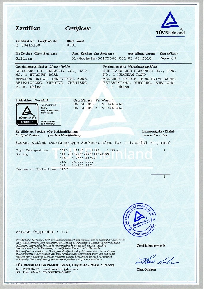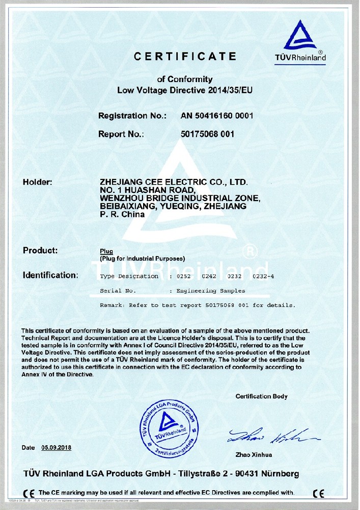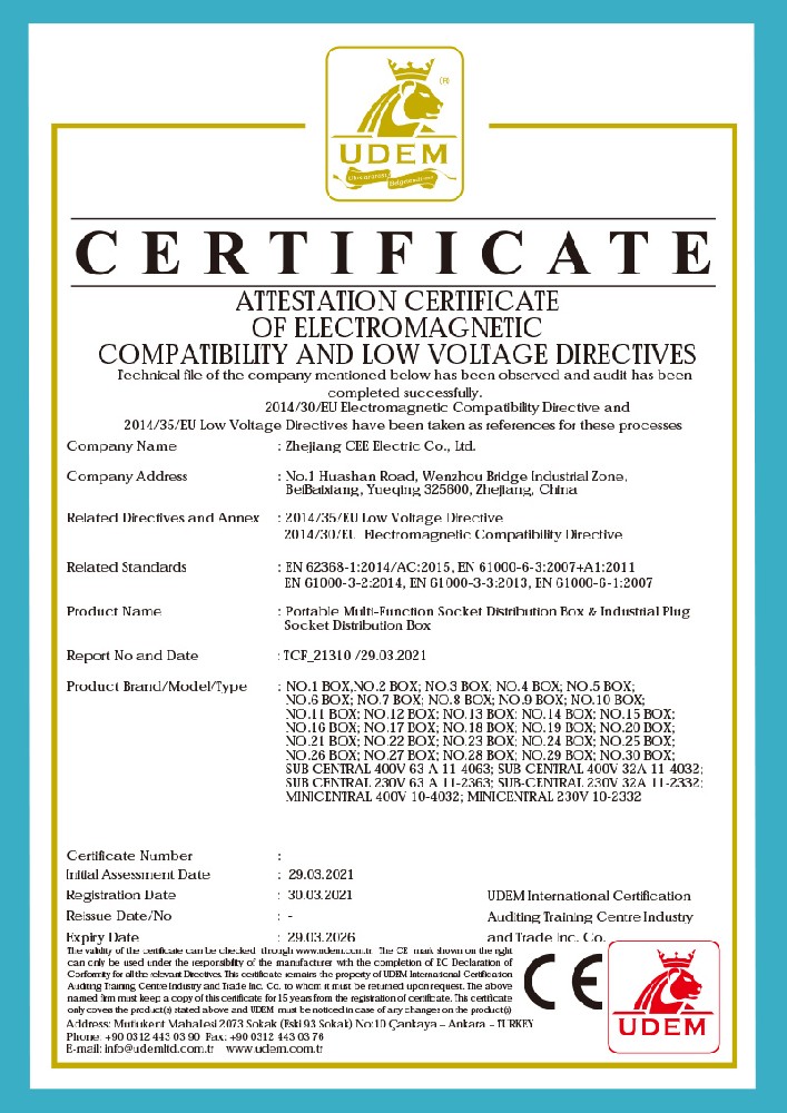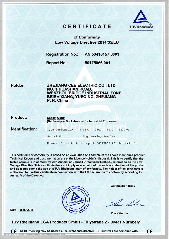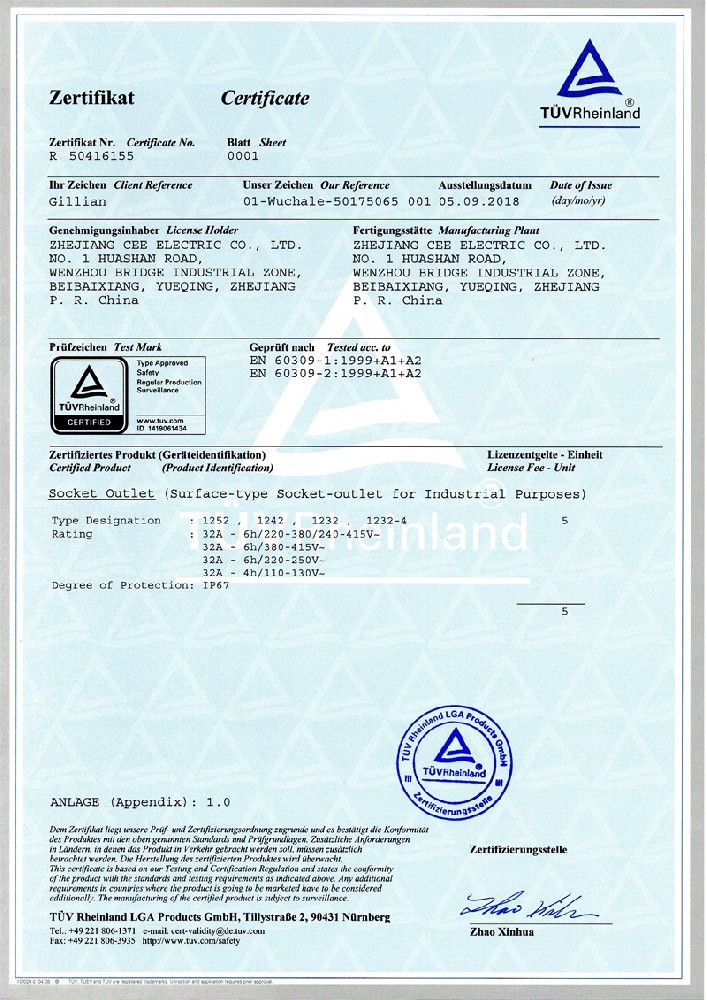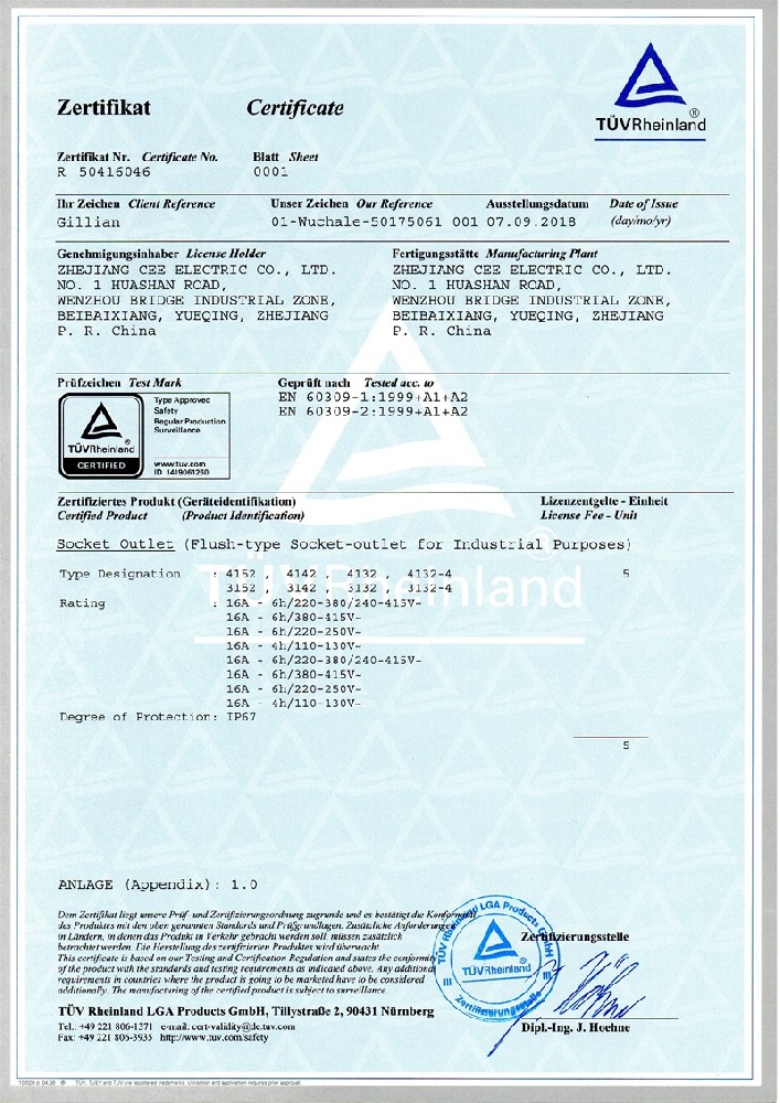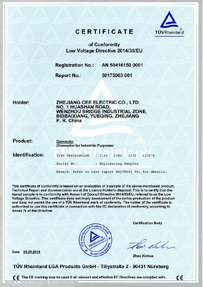 公司全面貫徹實(shí)施IS09001:2015質(zhì)量管理體系認(rèn)證。工業(yè)插頭插座符合IEC 603 09-1-2, EN 60 309-1-2國(guó)際標(biāo)準(zhǔn), 組合插座箱符合EN61439標(biāo)準(zhǔn),并通過(guò)Intertek & TUV Rheinland & CQC等認(rèn)證。證書包括TUV、SEMKO、CE、CB、EAC,并符合RoHS和Reach等適用法規(guī)。公司引進(jìn)先進(jìn)生產(chǎn)設(shè)備和精密檢測(cè)試驗(yàn)儀器、不斷引入高科技工藝流程和技術(shù)人才,為公司的產(chǎn)品研發(fā)、質(zhì)量升級(jí)、管理創(chuàng)新提供了強(qiáng)有力的保障。公司將持續(xù)以優(yōu)質(zhì)的產(chǎn)品和服務(wù),贏得客戶的最大滿意為宗旨,發(fā)揚(yáng)“創(chuàng)新、服務(wù)、溝通”的企業(yè)精神,力促CEE品牌從中國(guó)走向世界。我們牢牢把握時(shí)代賦予的使命和機(jī)遇,與海內(nèi)外合作伙伴共同開創(chuàng)事業(yè)的新高度。
