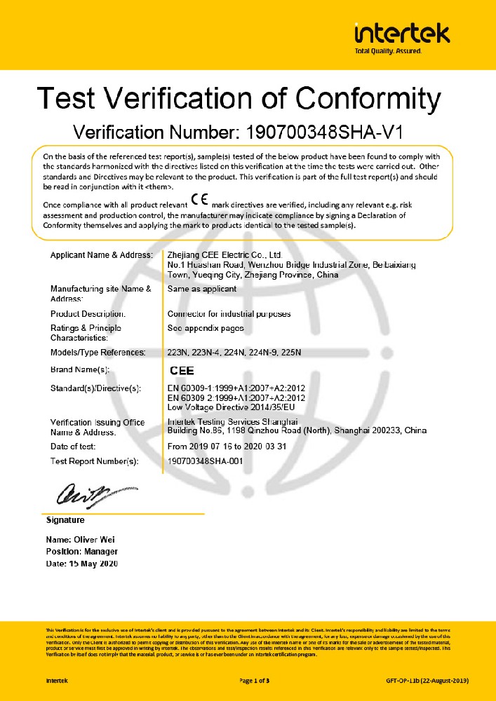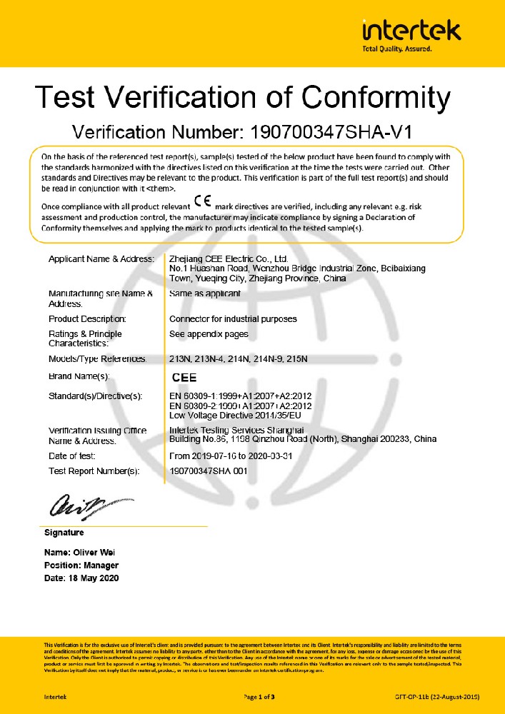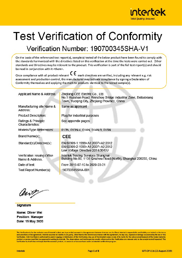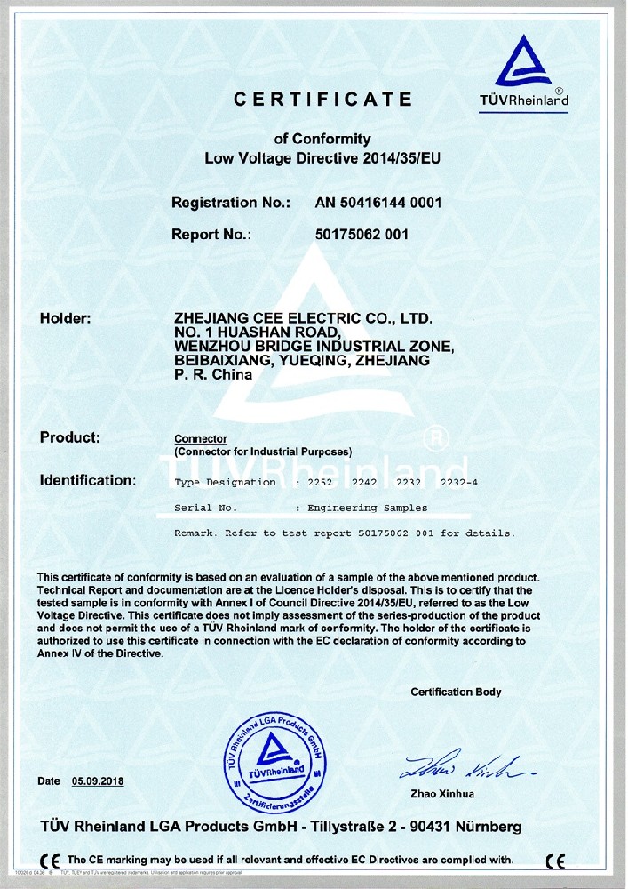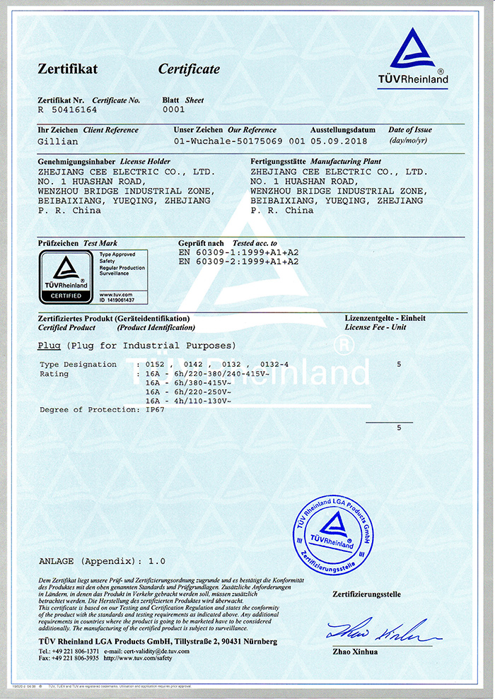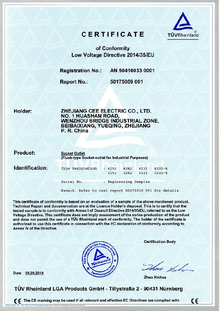 公司全面貫徹實(shí)施IS09001:2015質(zhì)量管理體系認(rèn)證。工業(yè)插頭插座符合IEC 603 09-1-2, EN 60 309-1-2國(guó)際標(biāo)準(zhǔn), 組合插座箱符合EN61439標(biāo)準(zhǔn),并通過(guò)Intertek & TUV Rheinland & CQC等認(rèn)證。證書包括TUV、SEMKO、CE、CB、EAC,并符合RoHS和Reach等適用法規(guī)。公司引進(jìn)先進(jìn)生產(chǎn)設(shè)備和精密檢測(cè)試驗(yàn)儀器、不斷引入高科技工藝流程和技術(shù)人才,為公司的產(chǎn)品研發(fā)、質(zhì)量升級(jí)、管理創(chuàng)新提供了強(qiáng)有力的保障。公司將持續(xù)以優(yōu)質(zhì)的產(chǎn)品和服務(wù),贏得客戶的最大滿意為宗旨,發(fā)揚(yáng)“創(chuàng)新、服務(wù)、溝通”的企業(yè)精神,力促CEE品牌從中國(guó)走向世界。我們牢牢把握時(shí)代賦予的使命和機(jī)遇,與海內(nèi)外合作伙伴共同開創(chuàng)事業(yè)的新高度。
